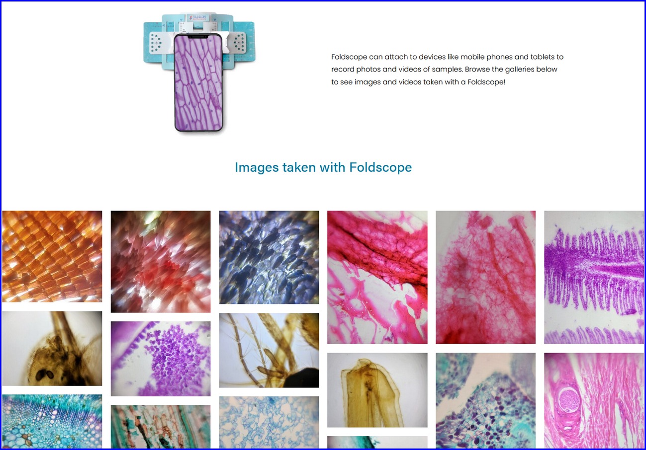 Foldscope DIY Microscope website screenshot including Images taken with Foldscope